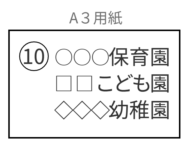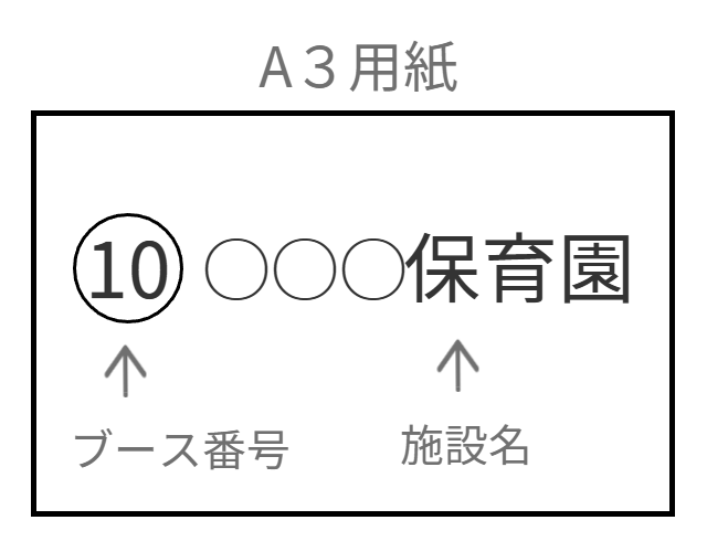 白色のA3用紙に『ブース番号』と『施設名』を記入していただき、自園のブースにお貼りください。