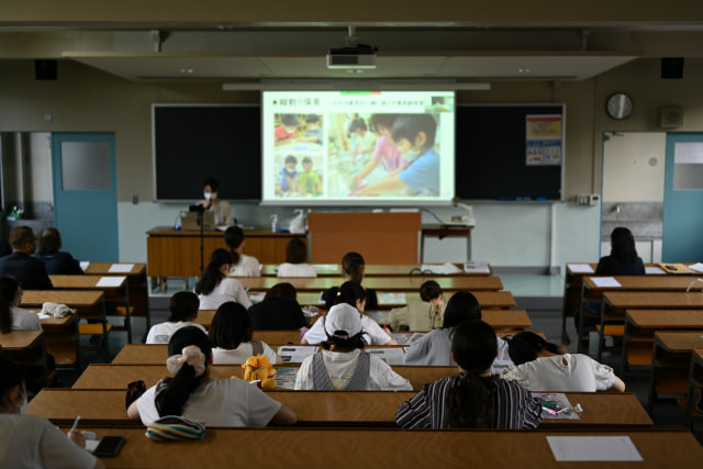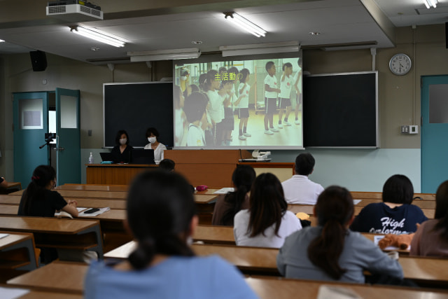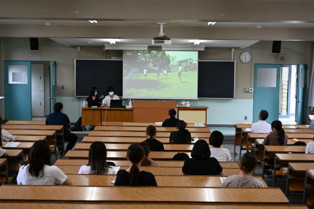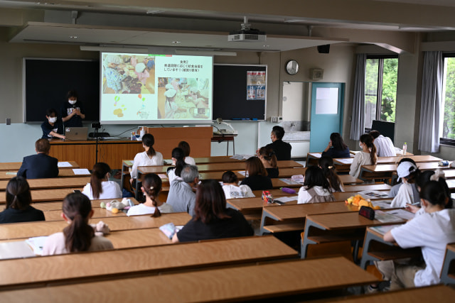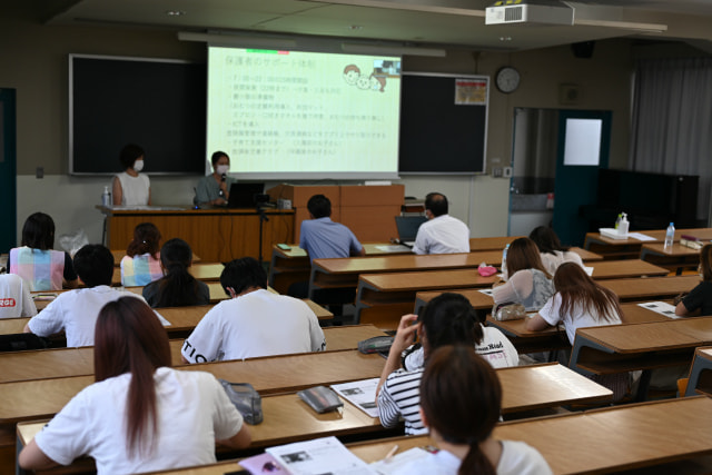 参加した学生にとっては普段聞くことのできない園の実際の保育内容や保育の様子を写真をふんだんに使った資料とともに見て聞くことができる良い機会になったようです。多くの学生が真剣にメモを取る様子が伺えました。