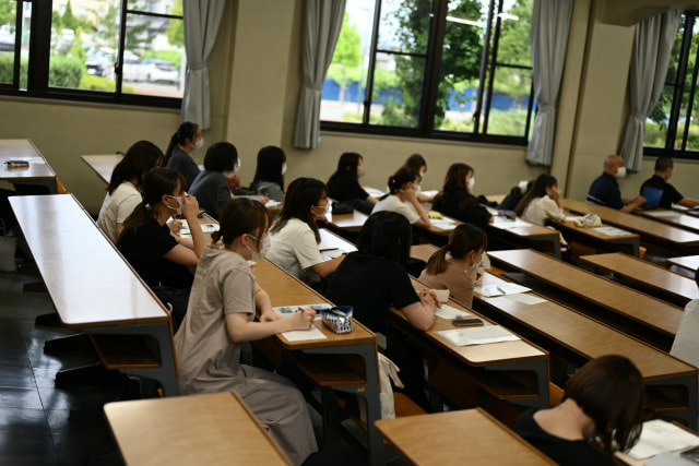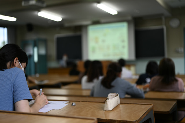 新型コロナウイルスの感染予防のため、4教室に分散して同時実施。